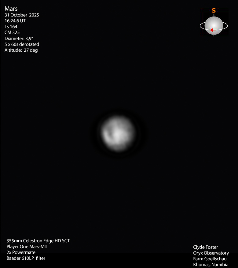 Another late season attempt at Mars under very challenging, windy, conditions. Syrtis Major can be made out to the left of centre. [Clyde Foster : Khomas,Namibia]