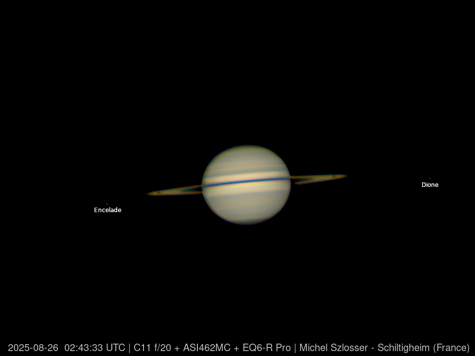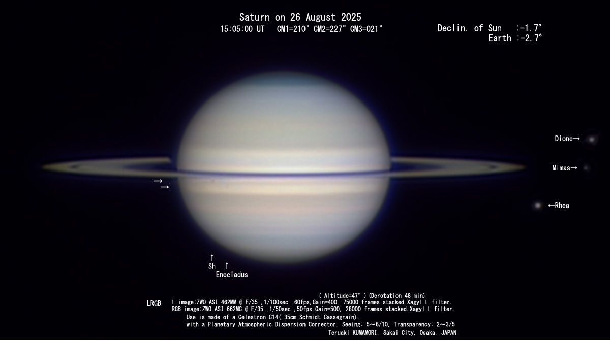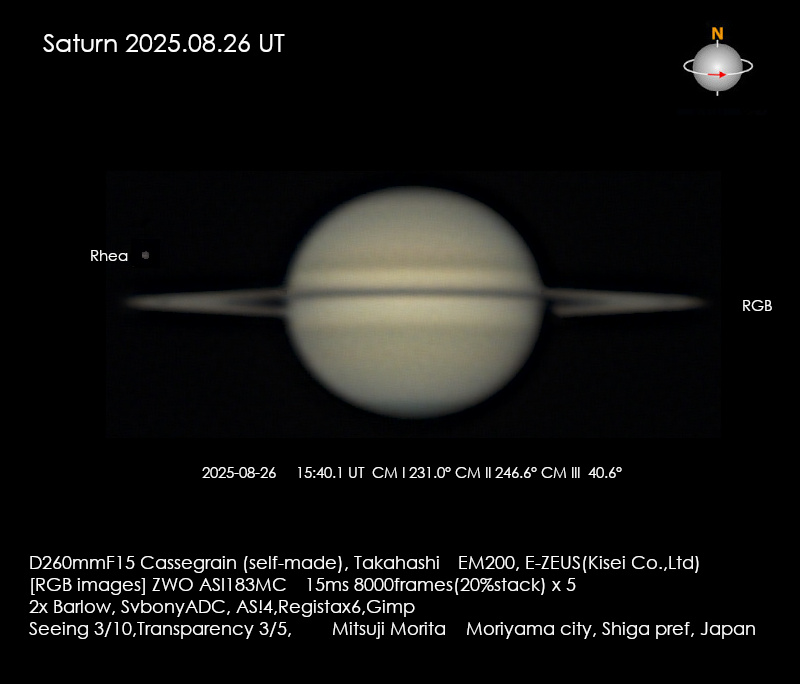 大気が不安定でシーイングもよくない。薄雲多く光量不足でした。Rheaの輝度は強調しています。