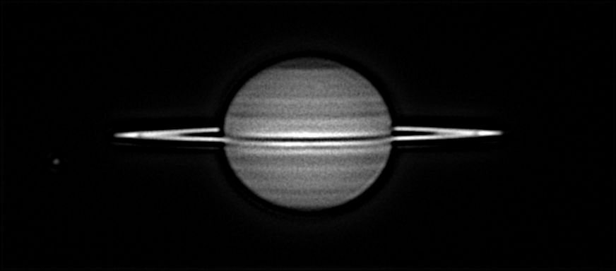 薄雲の透明度が悪い夜空だったが、気流が少し良かった。土星本体の縞模様は淡いが南極地方の北エッジが分かる。画像から作った南極地域の様子では多角形の様にも見える。
