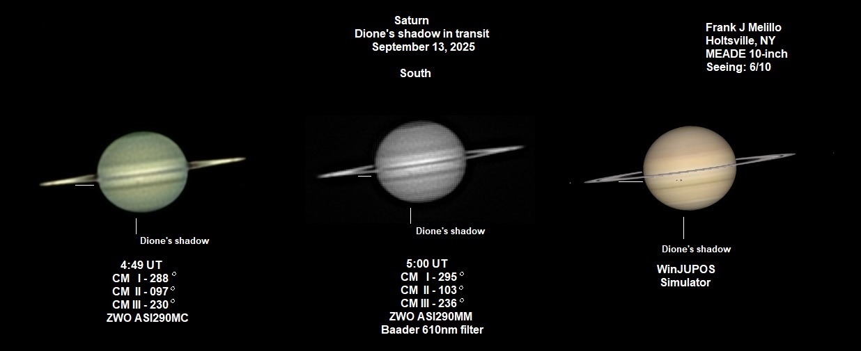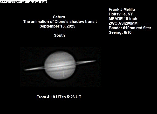 Saturn and Dione's shadow in transit on September 13,2025 between 4:15 UT and 5:30 UT.