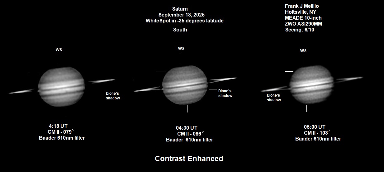 Saturn's faint white spot in the southern hemisphere on September 13, 2025 at 4:18 UT and 5:23 UT during Dione's shadow event.