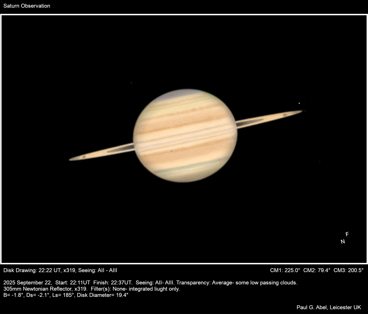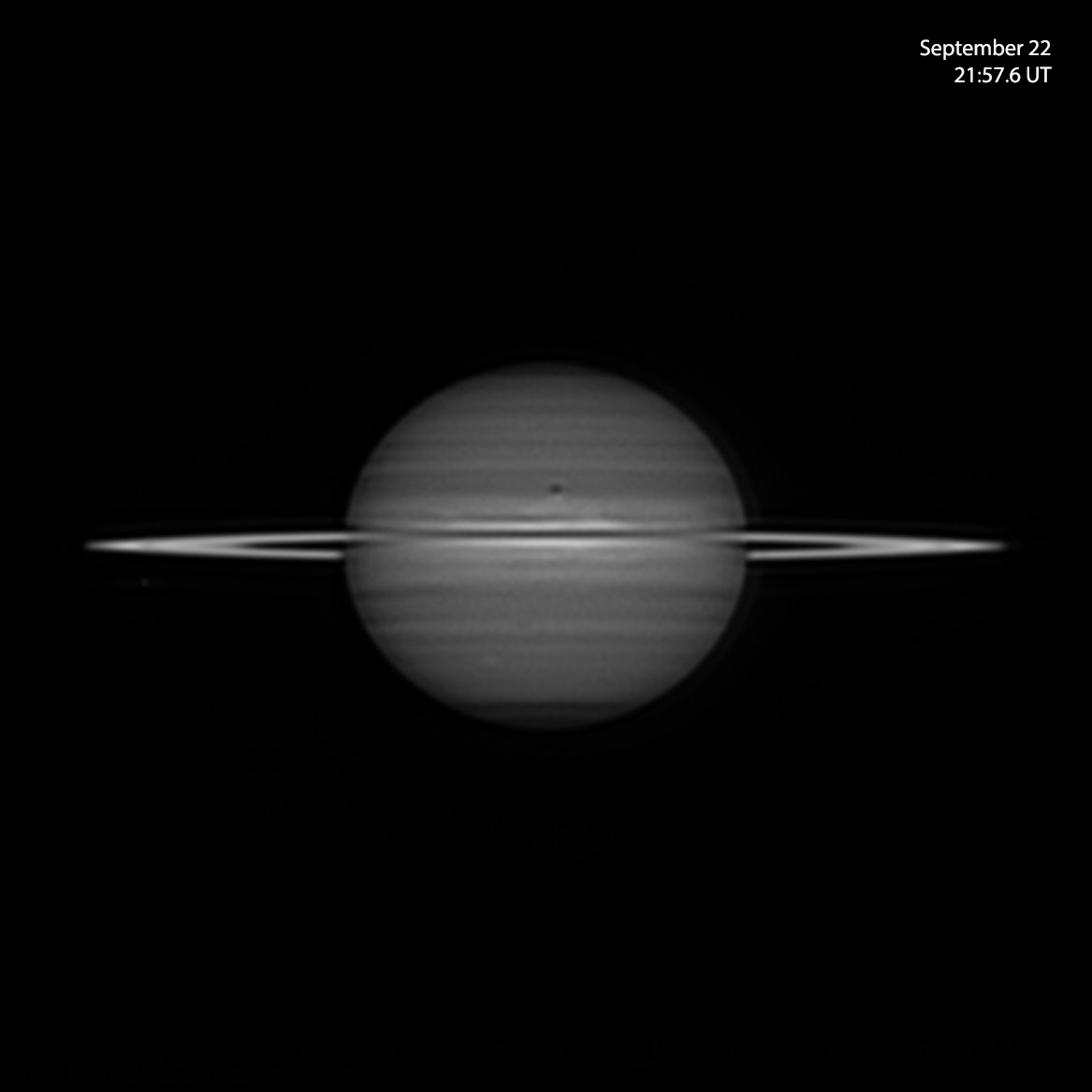 We had reasonable conditions here for a time on 22nd September and I made an observation of Saturn. Rhea was in transit during this time and in the moments of good seeing I was able to discern the satellite against the NEB. The shadow of Rhea would have been below Rhea but I was unable to see it.