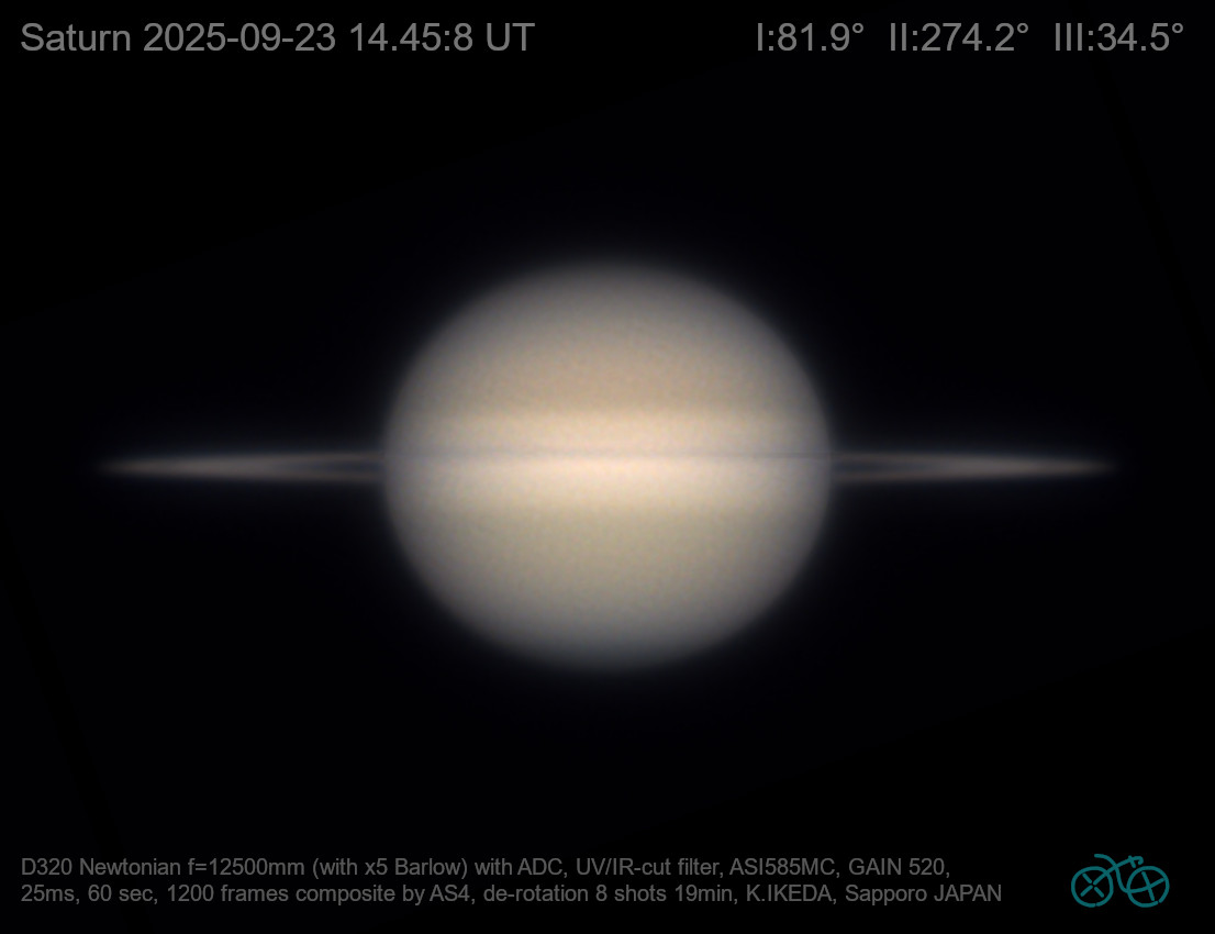 薄雲空の悪条件ですが土星環の本体の影がほとんど見えません。悪気流、イメージは悪いけど45p反射の光軸は良く合ってきました。
