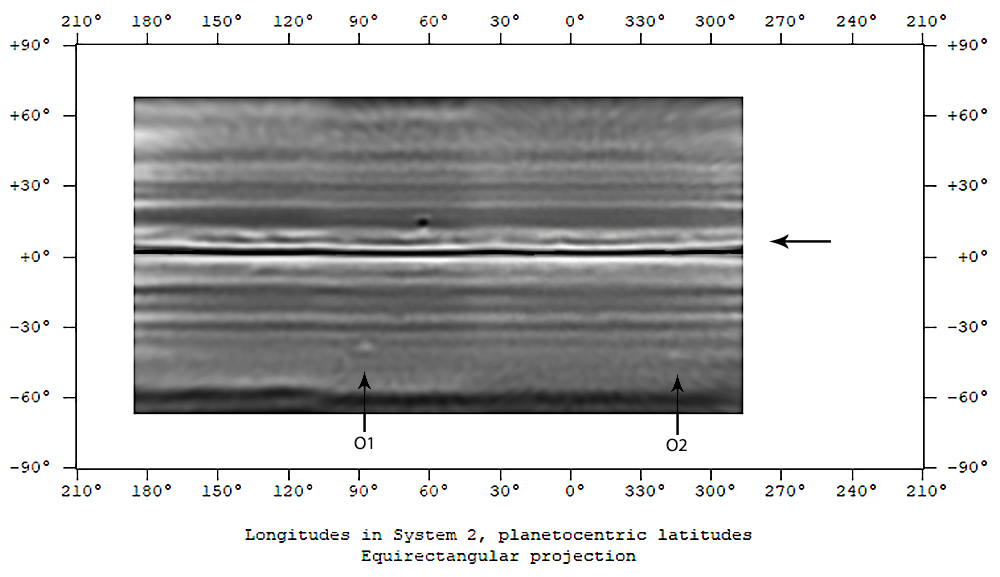 Of note are the two spots marked as O1 and O2 around the South Temperate Zone/Belt. However,note the many details in the Equatorial Zone North (marked with an arrow),some of which are visible also in RGB images. The Equatorial Zone South also presents some details,but much less obvious.