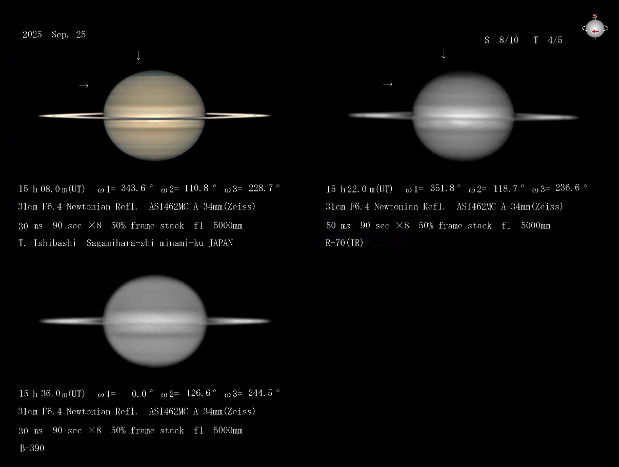 環が細くなってきて明るくなり、眼視では串団子のようです。気流が良く、カラーとIRの南半球に白斑があります。(矢印)