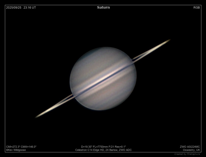The satellite Tethys is shown close to the rings in the drawing. Observations of Saturn concluded at 22:33UT.