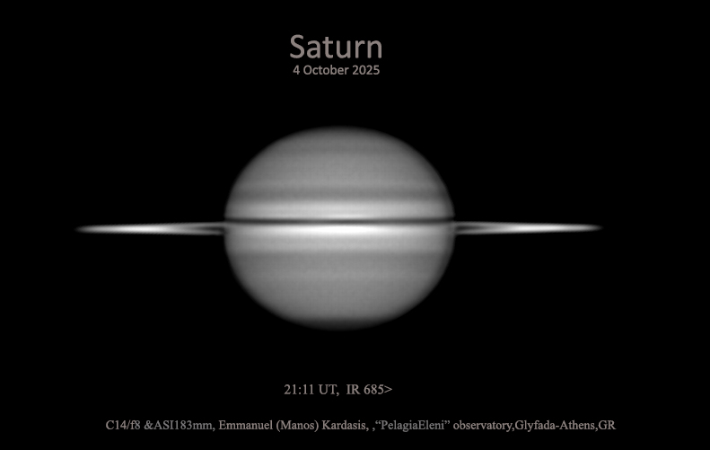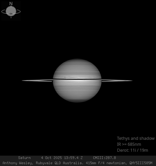 taken in reasonable seeing. The IR807 longpass image has been more heavily processed to highlight the faint cloud structure visible just above and below the equator. Tethys is in transit, it's shadow can be seen on the left just above the ring shadow.