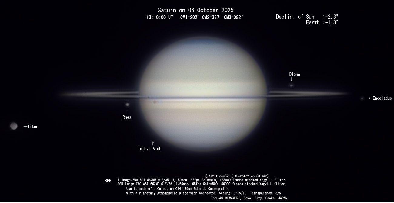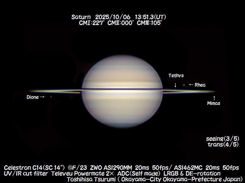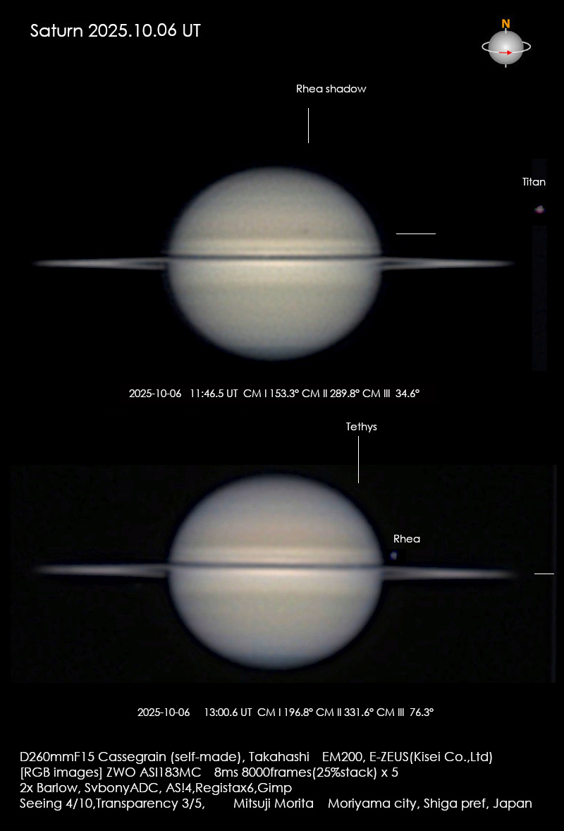 やや不安定な気流で雲も多く撮影に難儀した。Titan,Rhea,Tethysの本体,影などを辛うじてとらえることができた。