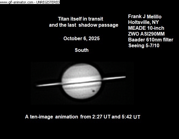 I have attached my 10-image animation showing Titan in transit and its shadow on October 6,2025 from 2:27 UT to 5:42 UT.