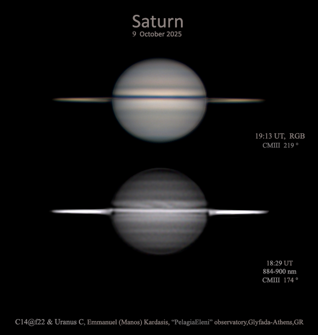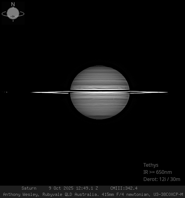 Tethys is visible to the left of the ring. 12 images captures over 30 minutes were combined to get this result.