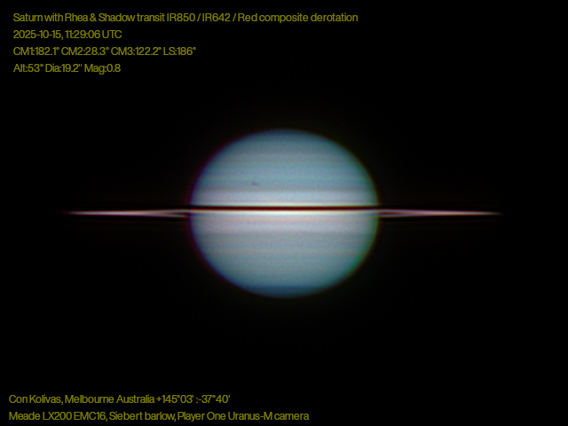 やはりシーイングは良くなく土星は揺れ動き、ピントもうまく定まらず変化していますが、数打てば当たる方式で撮像してみました。カラー画像と近赤外画像は、衛星レアの本体と影が微かに確認出来そうな感じですが、メタンバンドはただの光の塊にしかなりませんでした。