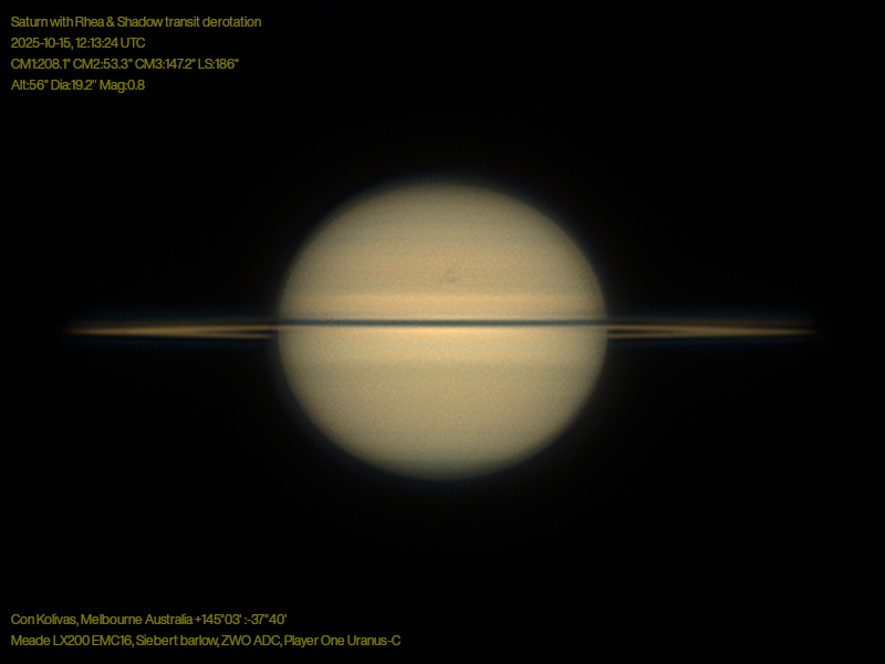 Rhea and it's shadow are present,although Rhea itself is very difficult to spot close to the equator.
