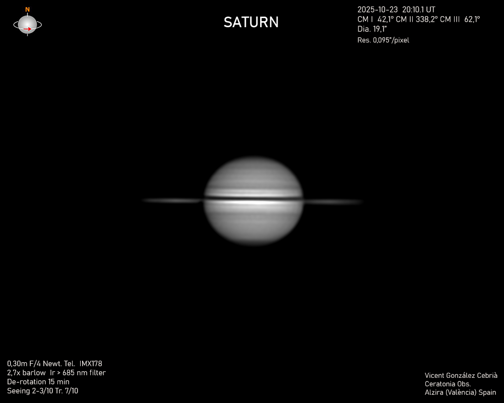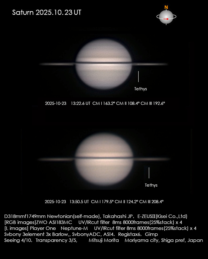 寒気の流れ込みで気温が低下。シーイング透明度ともに厳しい状況であったがリングに沿ってTethysの移動が確認できた。