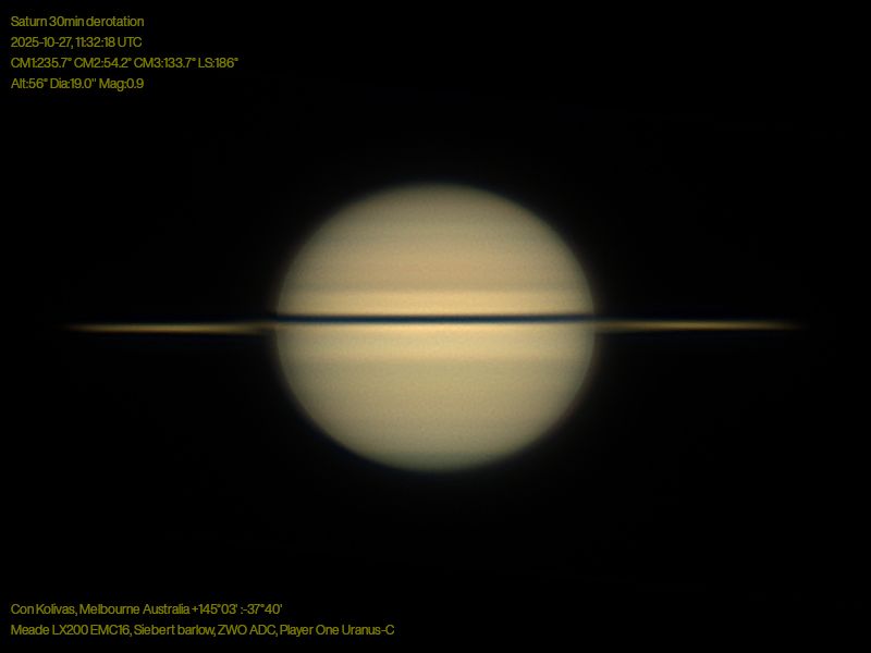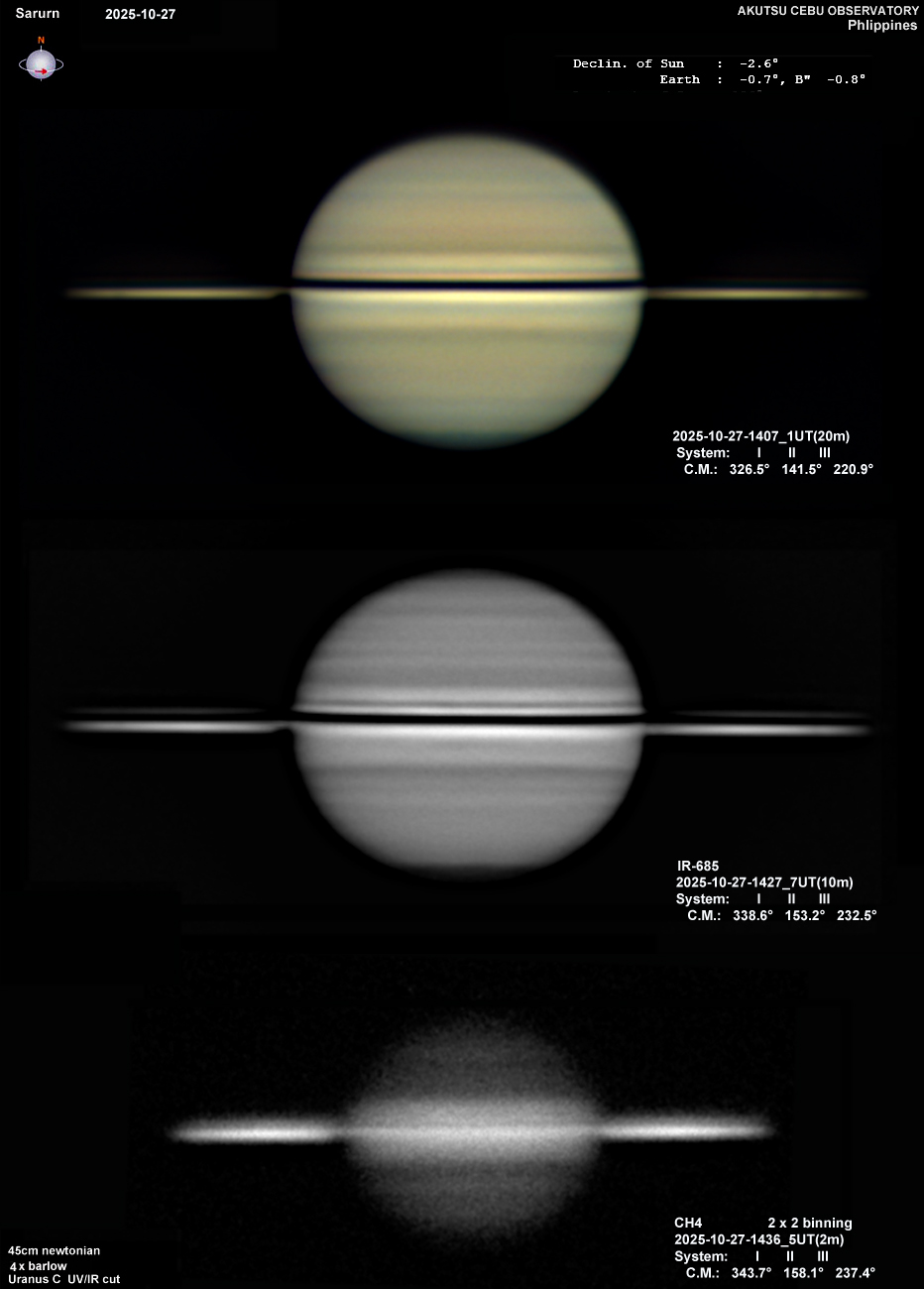 午後10時過ぎ、晴れて南中過ぎた土星を撮像。気流が少し安定し前回よりも良い。環の傾きがより小さくなった。10p屈折 30倍でも環がまだ分かる。