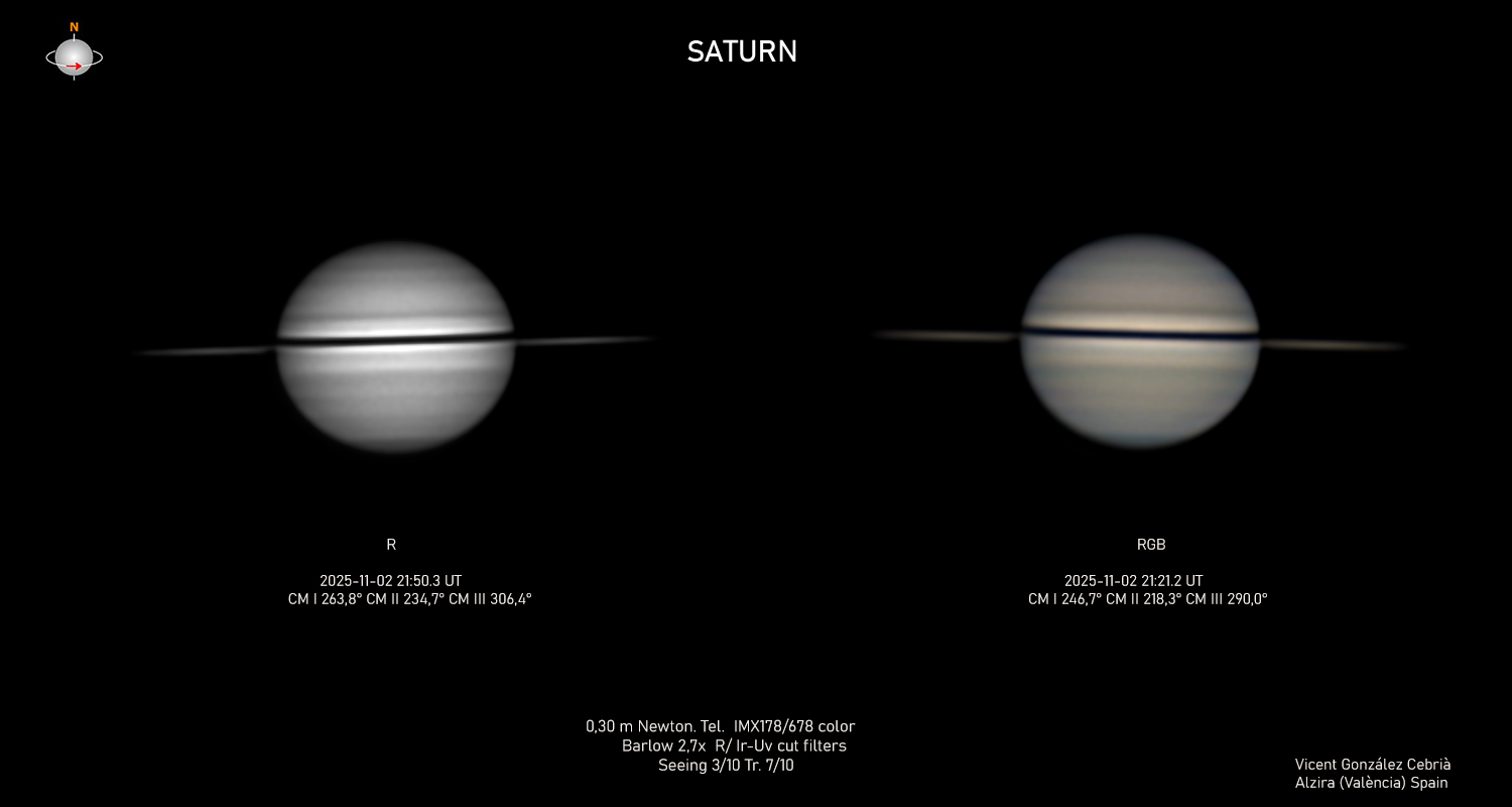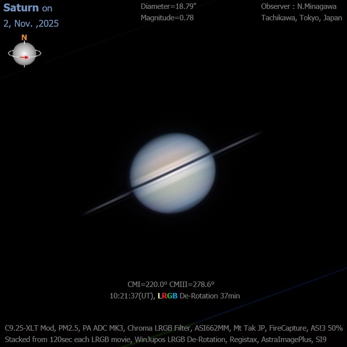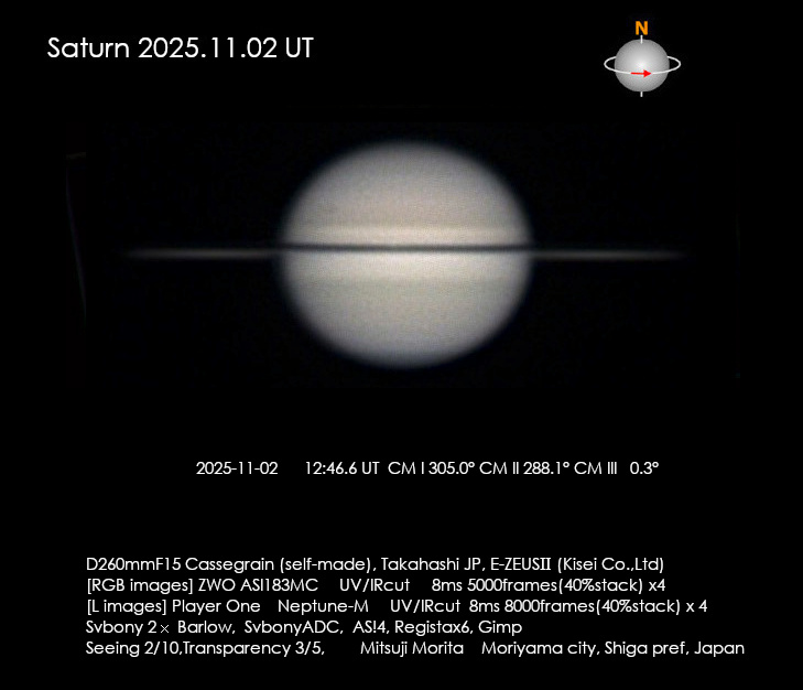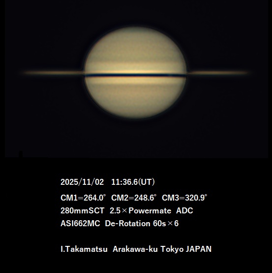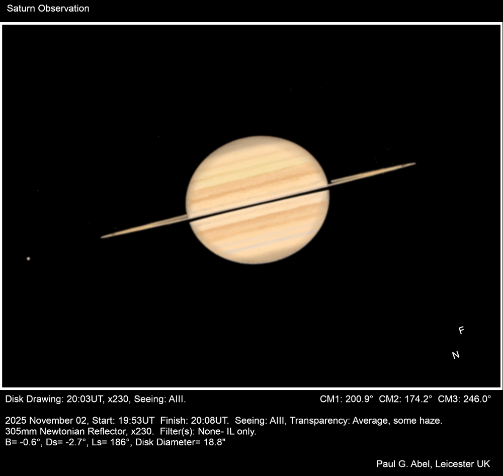 in average seeing conditions. The rings are now just -0.6° open and look like a slither of light. Although conditions were average and a power of x230 could only be used, a number of points of interest were observed: