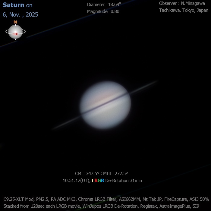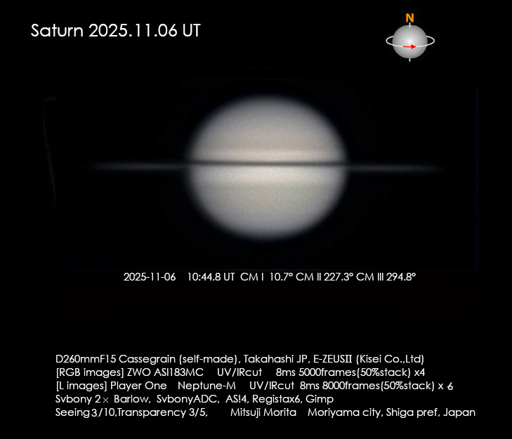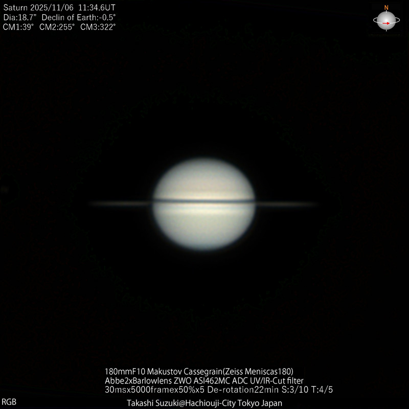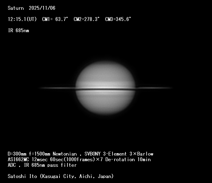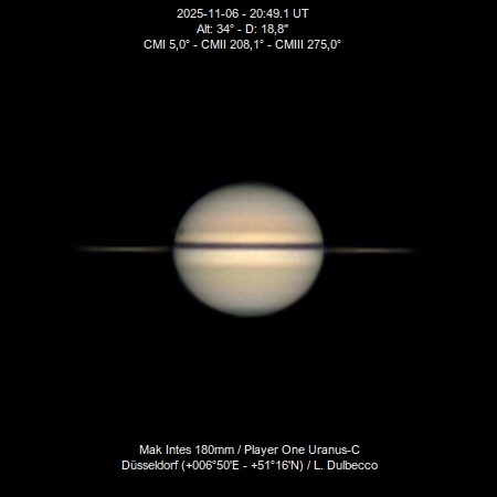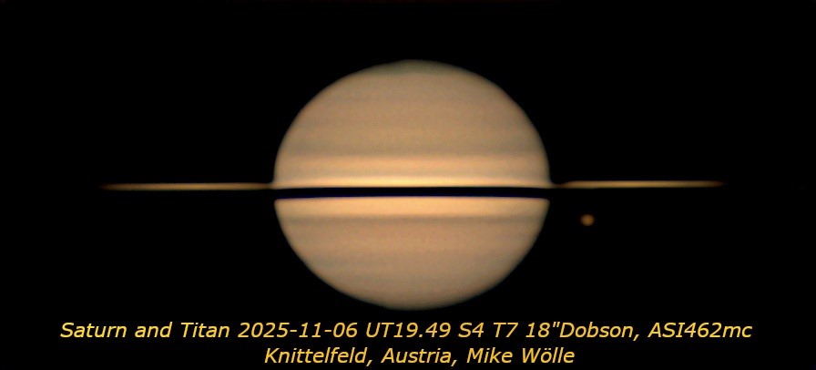 The Rings: These are very narrow now but there is a faint dark patch in the rings which indicate the Cassini Division. The rings appear to be of uniform thickness and I observed no condensations along the ansae.