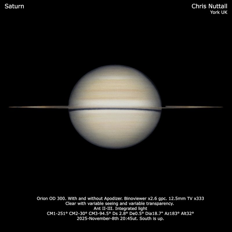 The rings displayed variations in brightness corresponding to the cassini division, a brighter section at ring A, and a dimmer section where ring C and the night time sky would be seen near the disc. Their shadow on the disc appeared slightly curved with the tiniest of gaps between it and the rings at the limb, which created a lovely 3D effect.