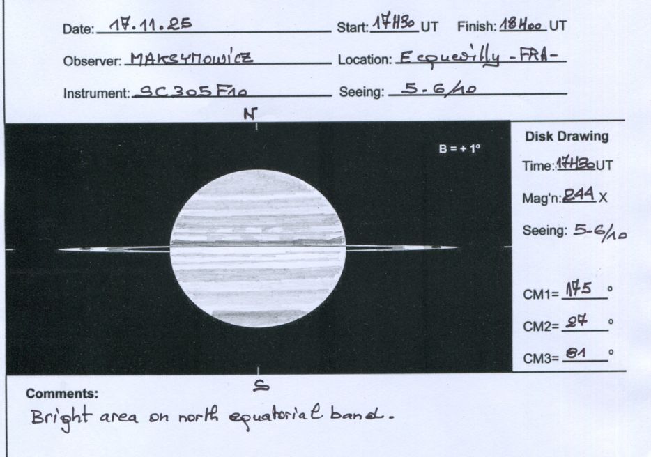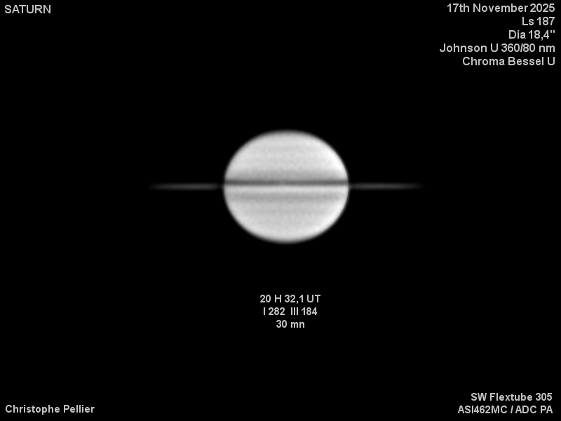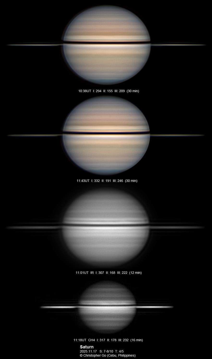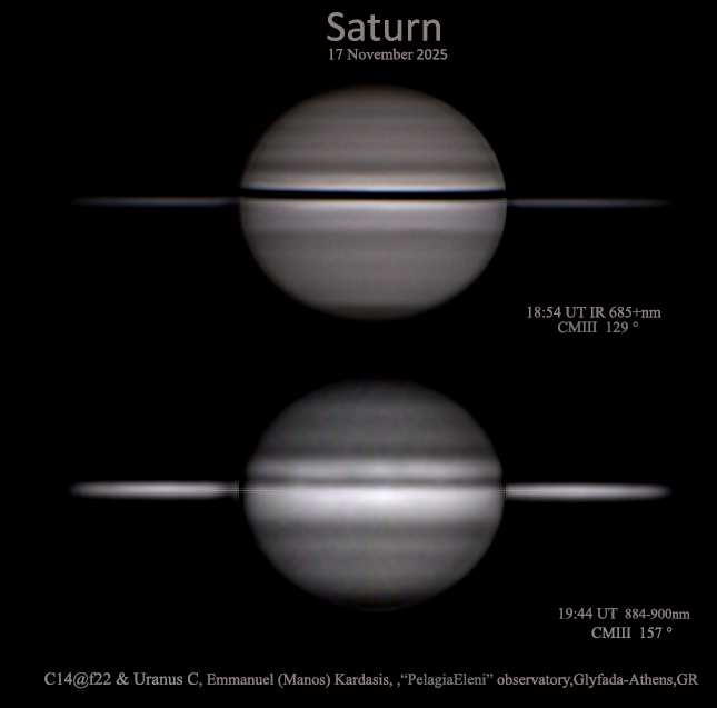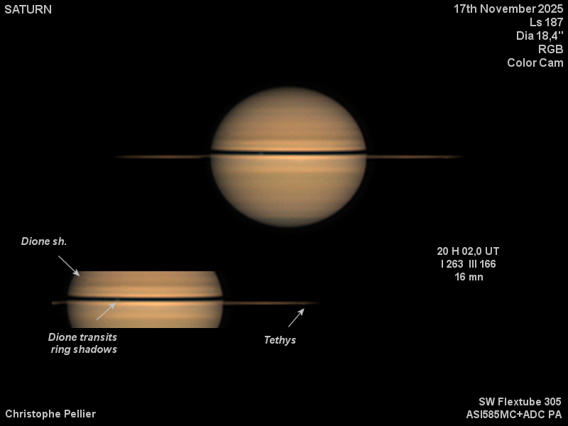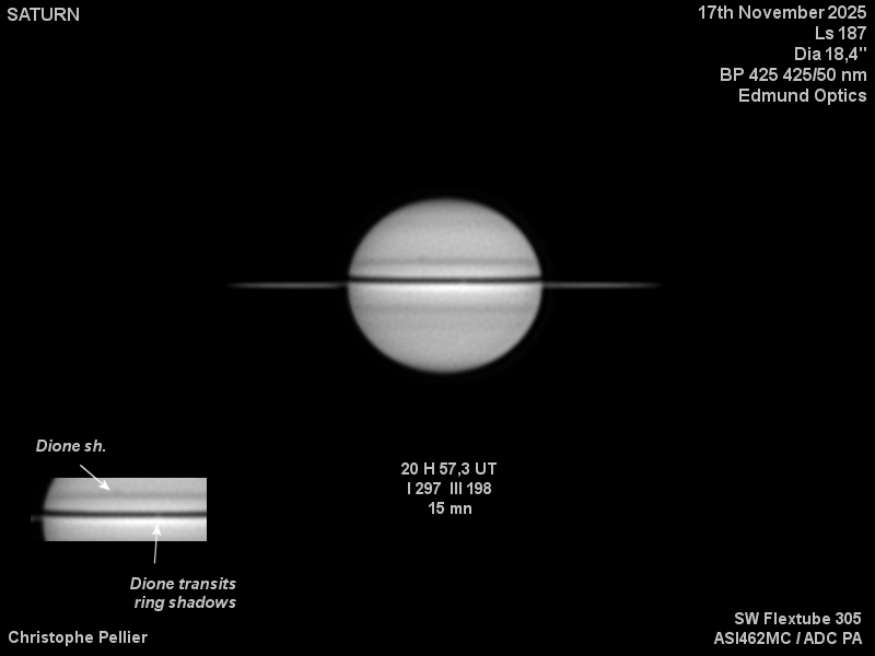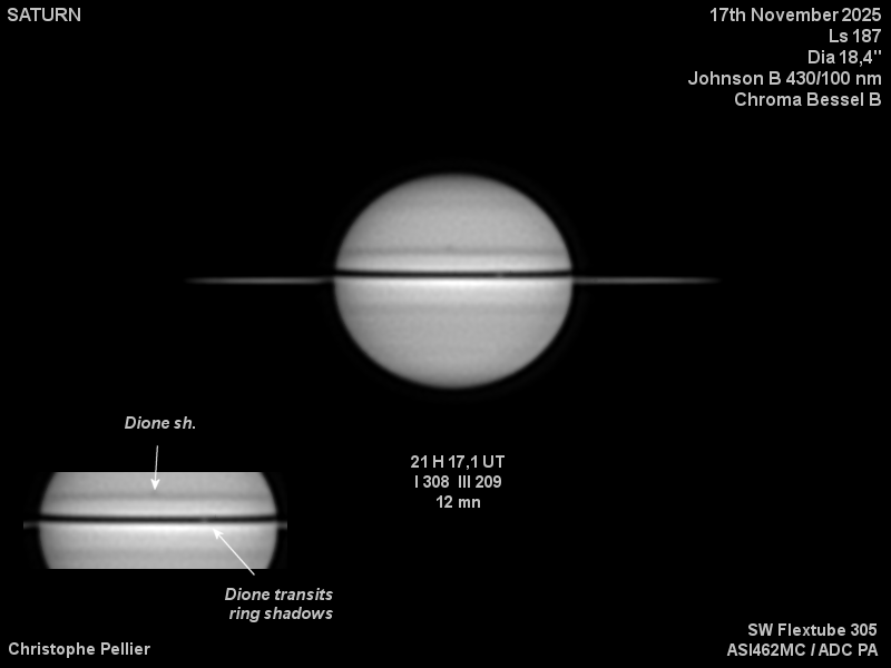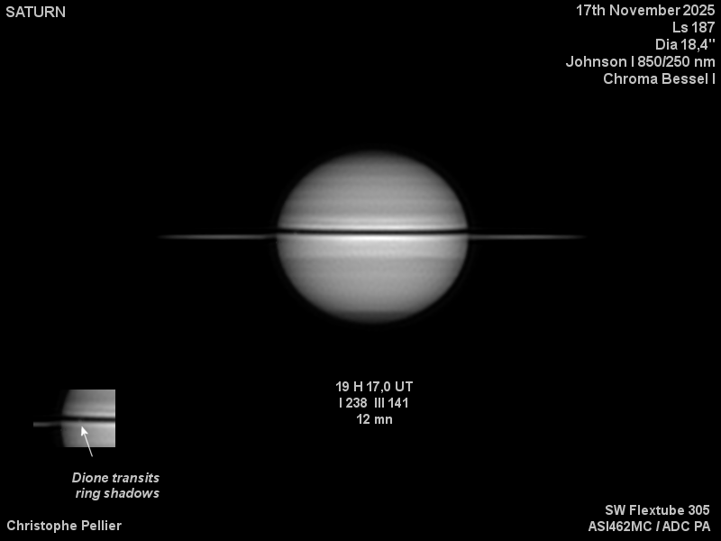 Dione and its shadow are followed in transit in front of the globe during the session.