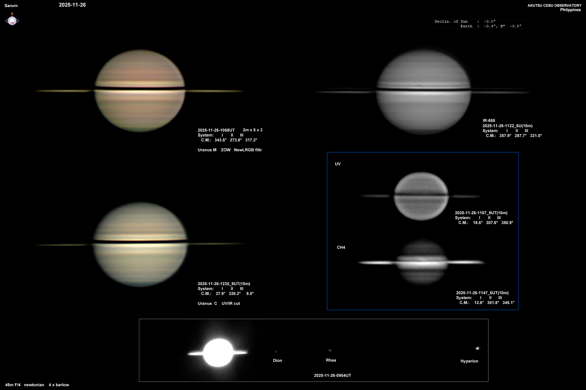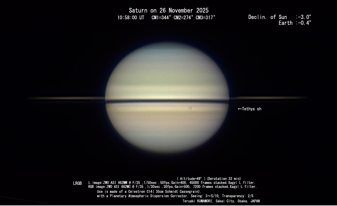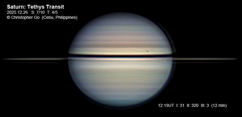 Saturn's rings are still close to it's minima. Tethys is in transit. It's shadow can be seen above the ring while Tethys is below the ring.
