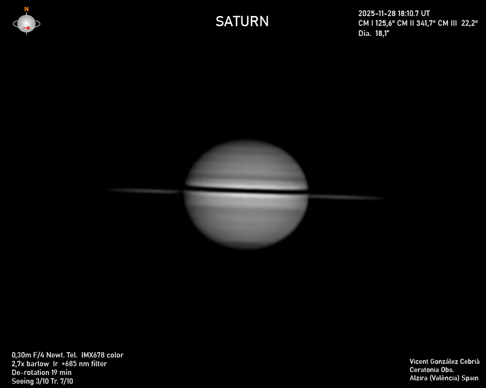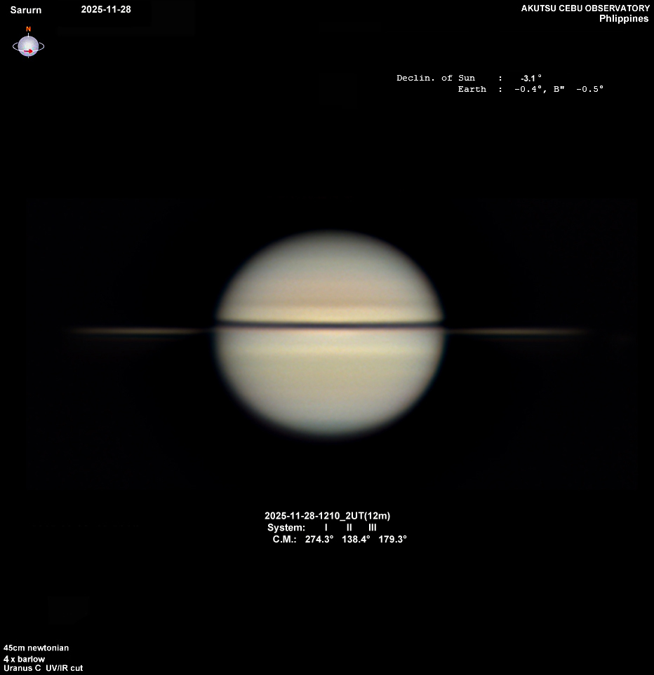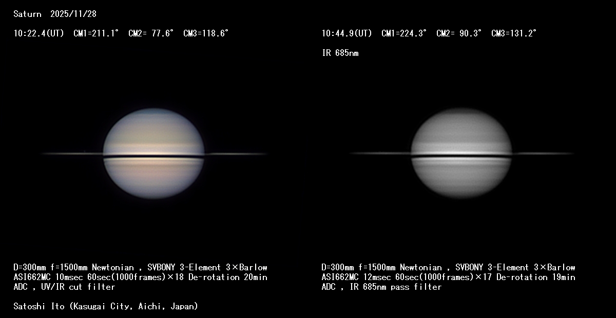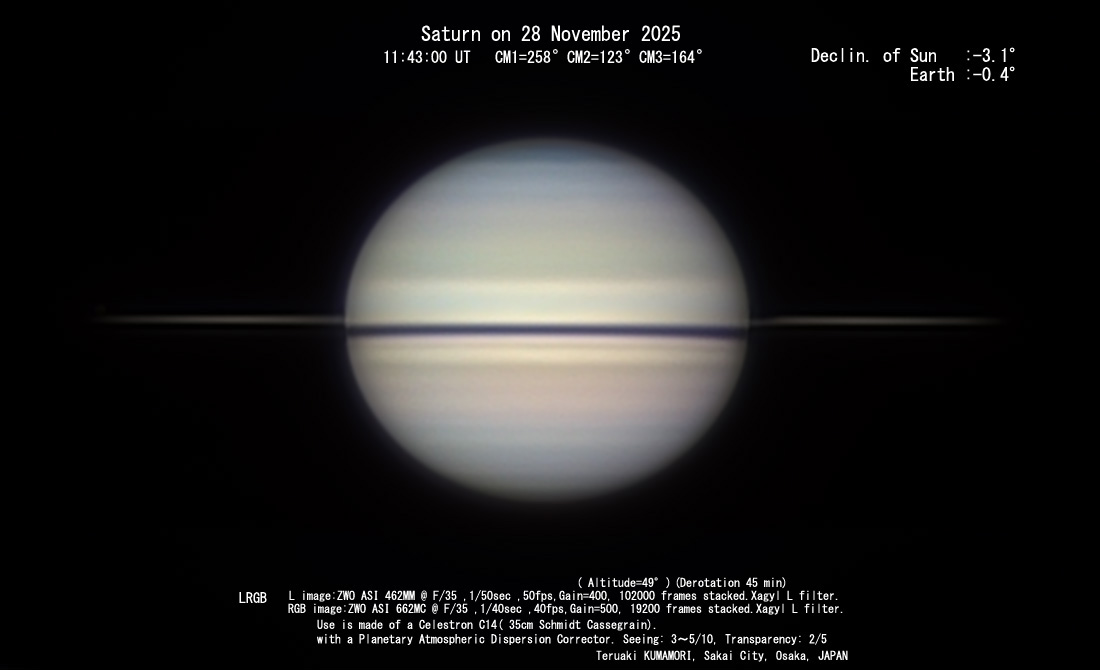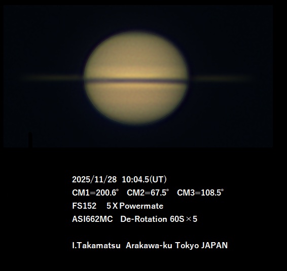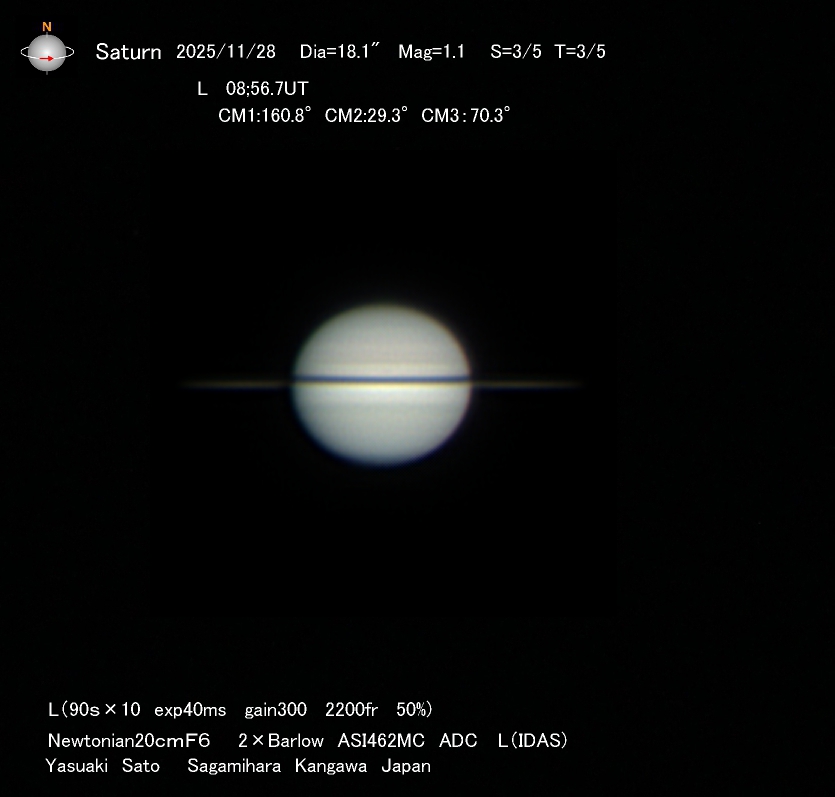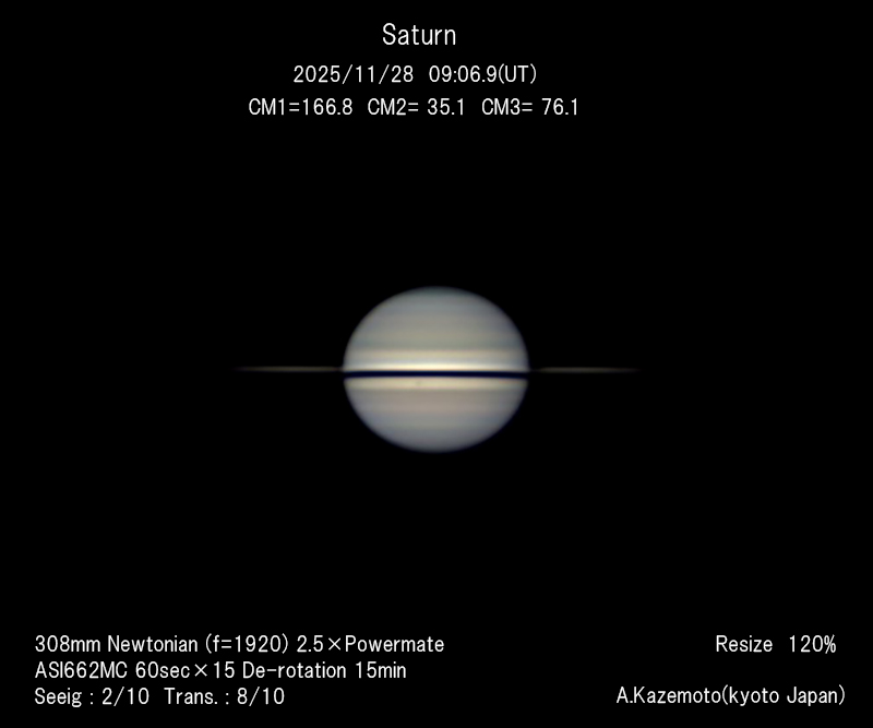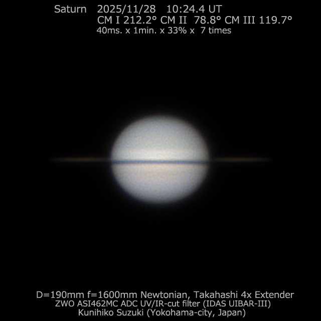 午後7時には南中する土星となった。夕方から晴れ出したが気流が安定していない土星 2025-11-27UT