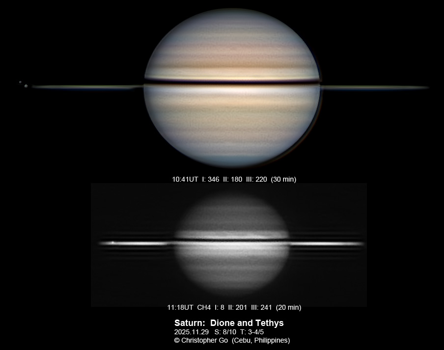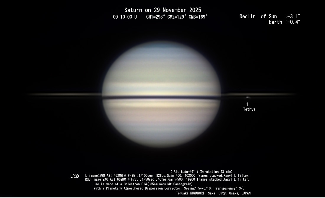 The rings are still very thin but they will begin to open up. Tethys are Rhea can be seen to the left of the ring. There is a small red spot at +32N at the CM.