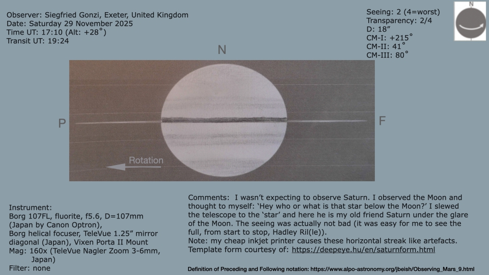 I am normally into observing Venus but as it happened I made a sketch of Saturn yesterday on Saturday evening. Of course there are limitations to what a 4.25” sized telescope is able to show (not sure but the glare of the Moon was of no help either).