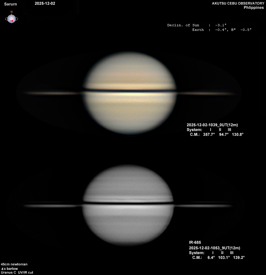 今回の土星の環の消失はありませんでしたが細い環を十分楽しむことが出来ました。50mmレンズでも分かりました。 11‐20から12-02までの土星環を並べてみると気流や透明度の違いから色や環のイメージが個々に違い変化を見ることは無理でした。 ≪Cebu PHILLIPINES 阿久津富夫≫