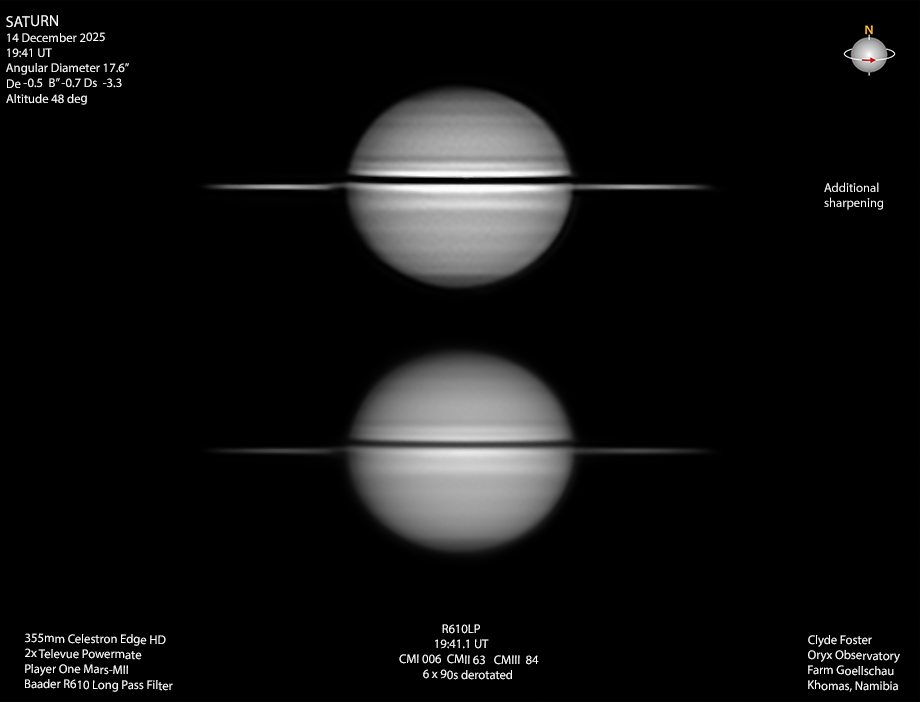 A gap in the recent cloudy weather allowed me to check in on Saturn yesterday evening. Average seeing conditions, and nothing obvious to note.[Clyde Foster : Khomas,Namibia]