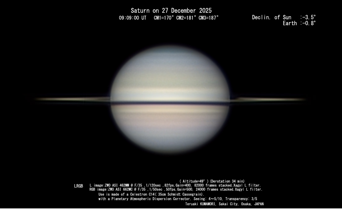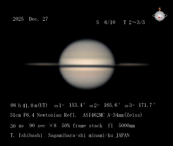 薄雲がありましたが、オートゲインで助かりました。冬型が少し緩んだのかカシニの空隙の所で少し環の明るさが変わっているようです。(Tutomu-Ishibashi Kanagawa-P Japan) ≪神奈川県 相模原市 石橋力≫