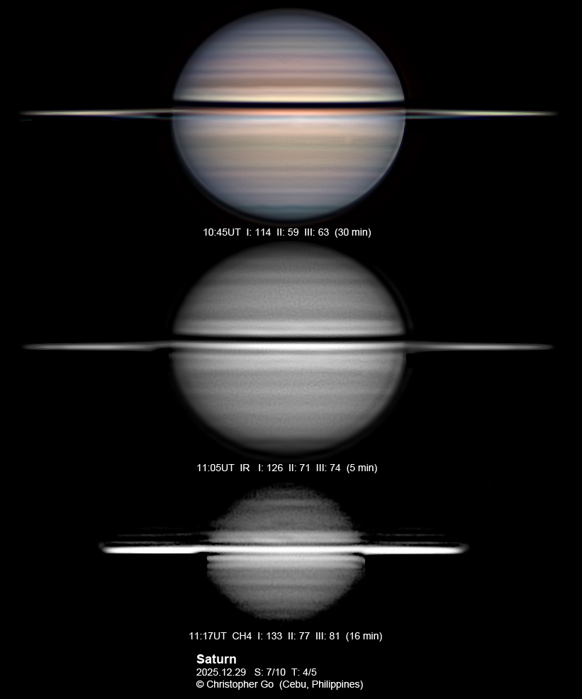 Seeing was average today. I was fortunate that the cold front disappeared overnight. This image is a monochrome capture. There is a low contrast white spot on the SEB on the right after the CM. The ring is now opening up and no longer a line.[Christopher Go : Cebu Philippines]