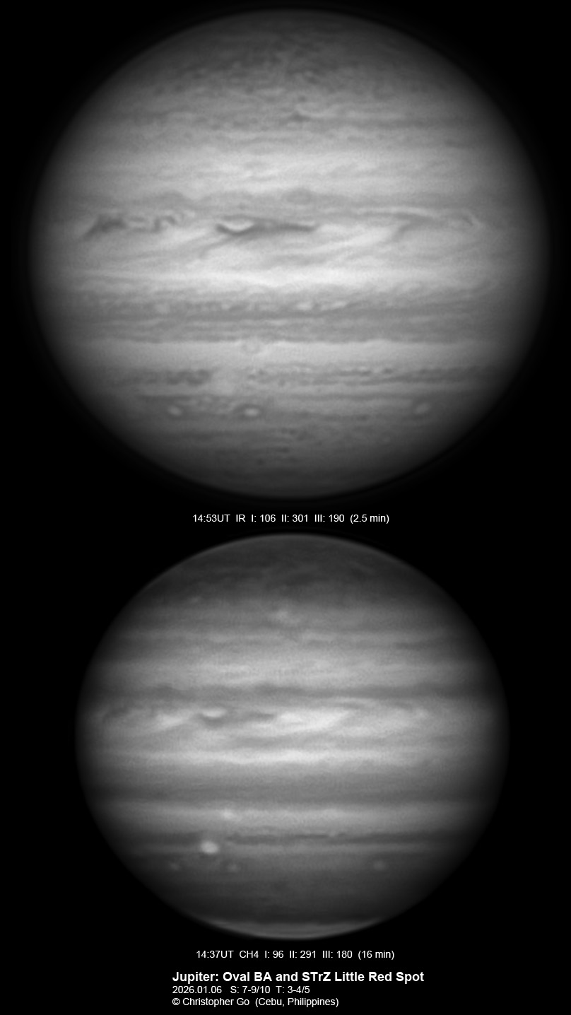 The red ring of Oval BA is resolved. The STrZ little red spot is almost above Oval BA. The NEB is narrow in this region.