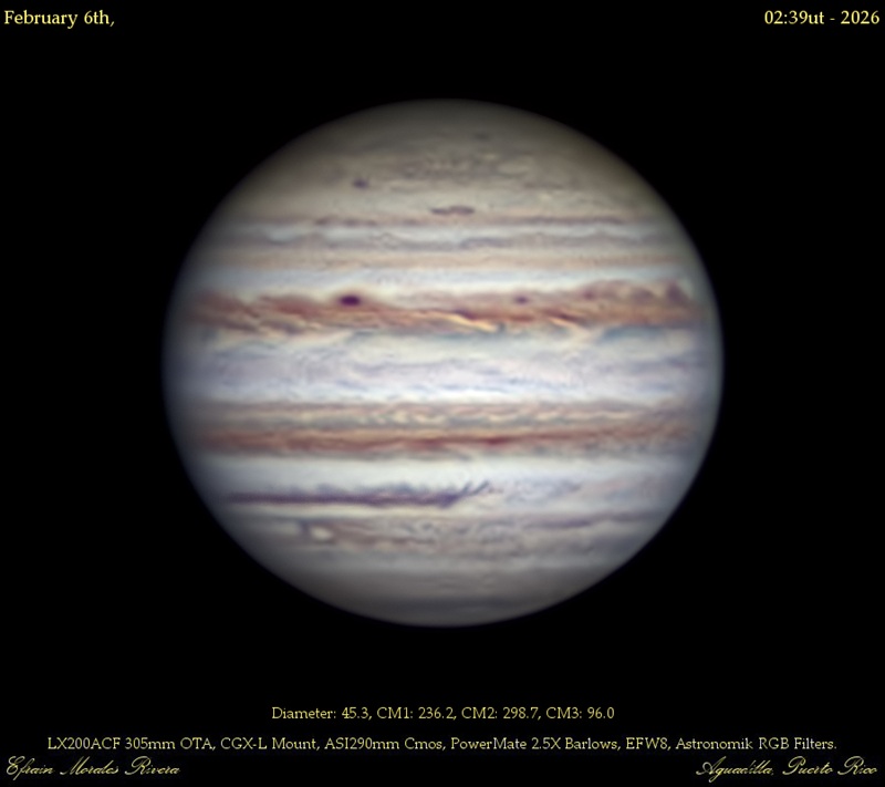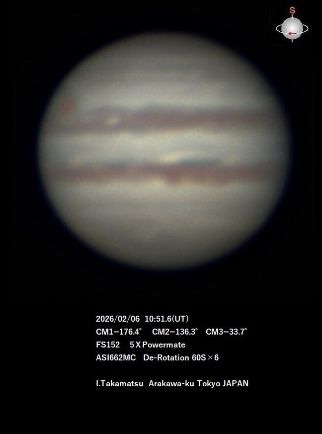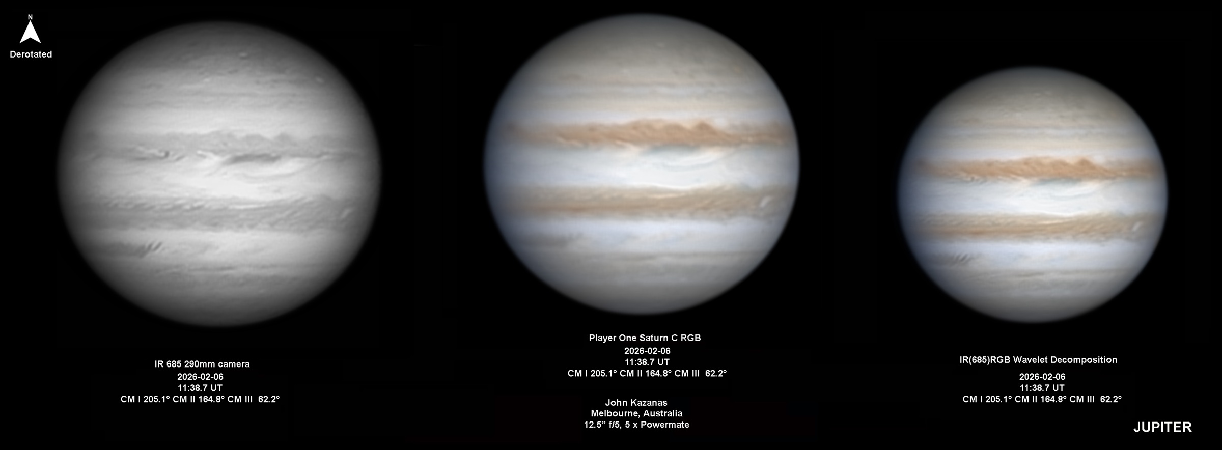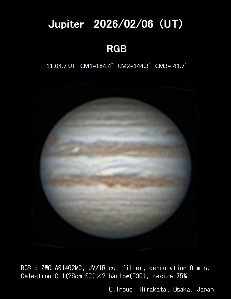 I have attached my first RGB images of Jupiter with a new ASI585MM Pro camera on February 6,2026 at 00:22 UT.