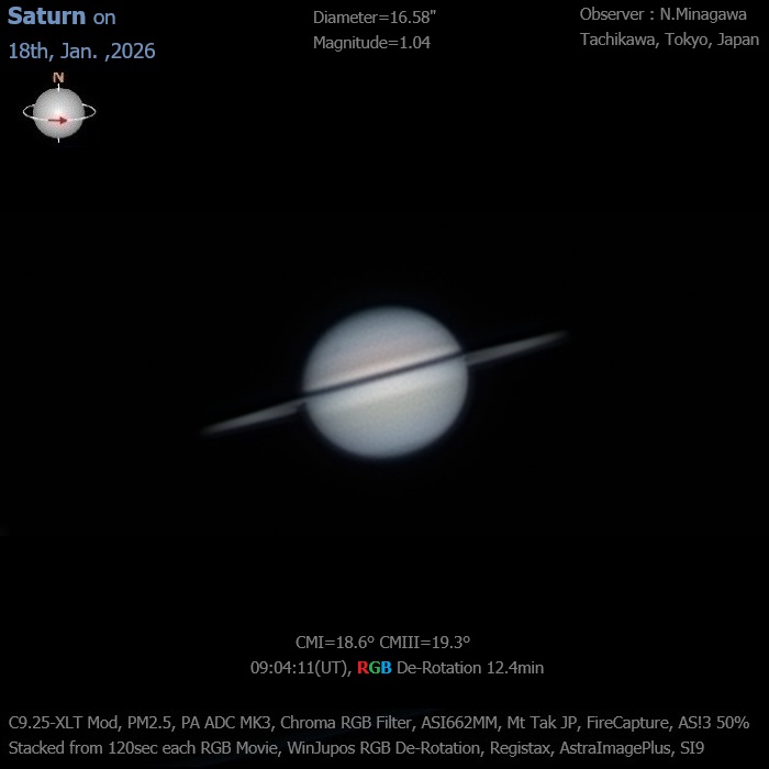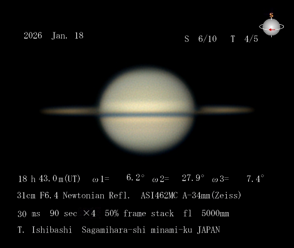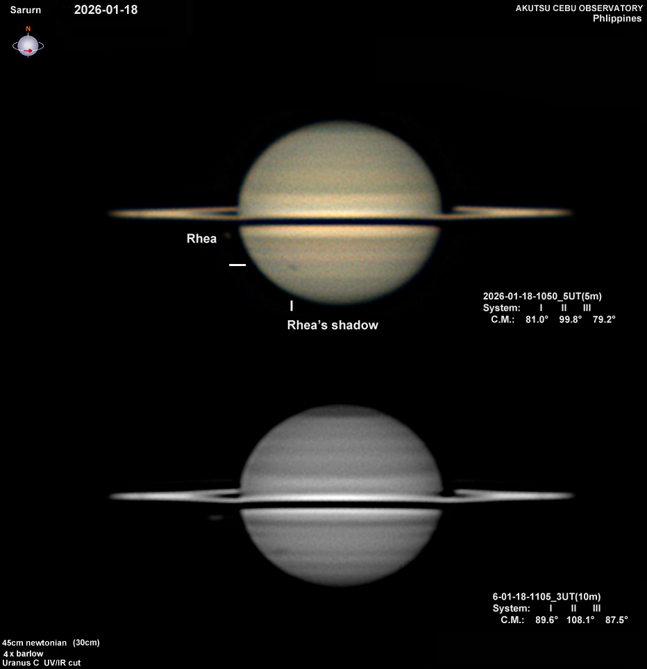 夕方透明度が良かったので西空の土星を撮像。開きつつある環が良く分かる。衛星Rheaとその影が見えています。 気流が不安定だったので口径を30pに絞りましたたが、効果はあった様です。≪Cebu PHILLIPINES 阿久津富夫≫
