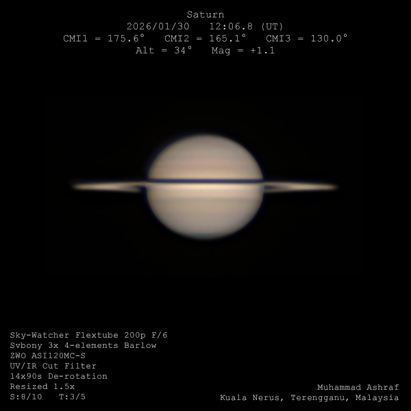 体調不良などで久しぶりの土星は西に傾くのが早くなり、鏡筒を東側にしたところ、なぜか像揺れ(ブレ)が収まらず、 赤緯クランプフリーにすれば多少落ち着くのが分かったので仕方なくその状態で撮影しました。≪愛知県 春日井市 伊藤了史≫[Satoshi Ito. Kasugai City,Aichi,Japan]