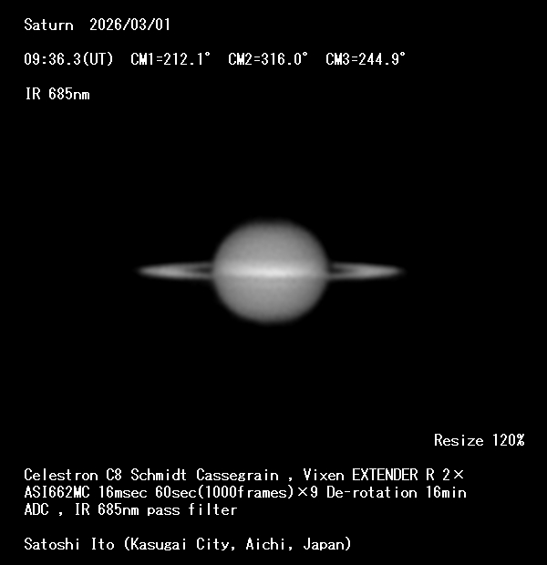 土星は西に傾き、日没時には観測室から見えなくなったので観測室外に 昨年入手した古い(多分40年位前)セレストロンC8を設置して撮影してみました。 ≪愛知県 春日井市 伊藤了史≫[Satoshi Ito. Kasugai City,Aichi,Japan]