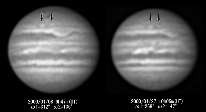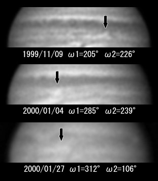 STB(南温帯縞)にある2個の白斑BEとFAは1月も健在です。大赤斑の南を通過した2個の白斑の画像を図1に示します。2個の白斑の距離は1999年8月末に13度まで接近しましたが、大赤斑に後方から接近した10月頃には16度まで広がりました。2つの白斑の間にできたSTB内の小白斑も、大赤斑の南を通過中の12月7日まで見えていましたが、2つの白斑の距離が広がったためかその後消失しました。