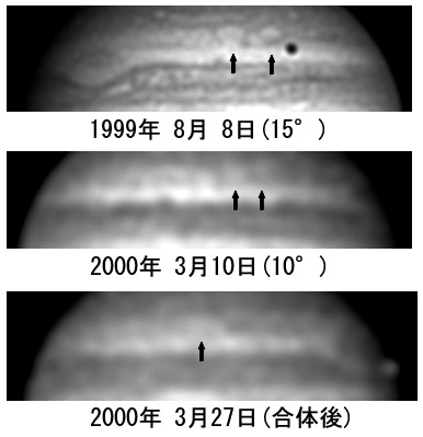 1999年8月 8日:BEとFAの間に時計回りの小白斑が見える。 2000年3月10日:BEとFAの距離は10°まで接近し、合体が近い。 2000年3月27日:BE/FAの合体後の白斑。