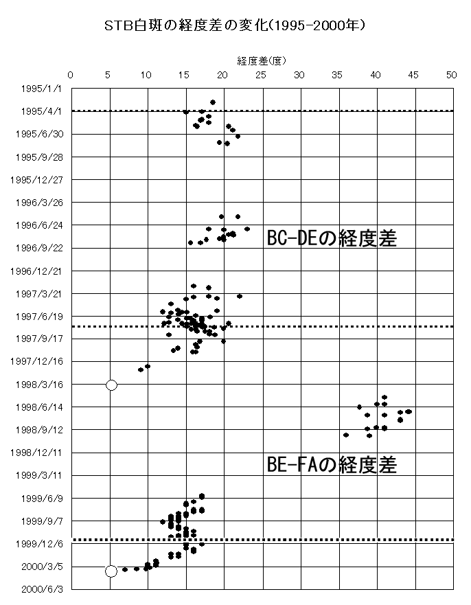 BC-DEは1997年8月に大赤斑を通過すると、急速に接近し、1998年3月に合体した。 BE-FAは一度13°まで接近し、大赤斑通過時に16°まで開く。大赤斑通過後の2000年1月から急速に接近し、3月に合体した。両者とも似たような経度の変化を示しています。