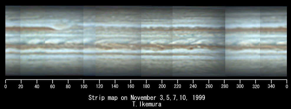 展開図は、木星の全面の様子を知るためには重宝なツールです。いくつかの円筒図法がありますが、一般的なメルカトル図法よりは、実際にながめている木星像と違和感の少ない等積円筒図法が良いと思います。1999年11月3-10日に得られた8枚の画像から作成した展開図を掲載します。