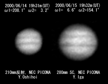 今年の木星は、かなり北寄りに昇ってきたのに驚きました(メンバーの中には隣の屋根がじゃまになって架台をシフトしたとか、シーズン初めのトラブルですね)。夏至に向かって日の出が次第に早くなるので、低空の木星を見つけるのに苦労するのですが、今年は木星の緯度が高いので、昇ってからどんどん高度が上がってくれます。透明度の良かった6月4日UT(5日JST朝)に、合から28日後の木星の初観測となりました。とはいえ、楕円形の木星に、SEBとNEBの2本のベルトが見える程度でした(図1はシーズン初期の観測)。6月19日以降には細部までとらえた観測が得られるようになりましたが、今度は梅雨のおかげで観測数はあまり増えませんでした。