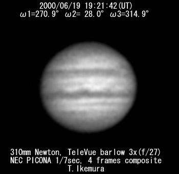 6月19日UTにGRS(大赤斑)を観測することができました(図2)。これまでと同様に、南半分がオレンジ色の楕円形の姿がとらえられました。経度は第2系で77°で、昨シーズンからの後退傾向が続いています。SEB(南赤道縞)は、これまで赤味の強い太いベルトでしたが、少し変化があるようです。まだ全周に渡って観測できていませんが、SEBsは濃く見えていますが、SEBnは経度によって淡くなっている個所があるようです。大赤斑後方のSEBの活動は残念ながら未確認でした。