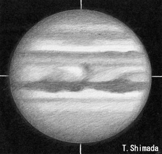 6月30日UTの嶋田氏の観測スケッチ(図3)で、EZs(赤道帯南組織)のGWS(大白斑)が観測されました(第1系で165°付近)。前後を暗斑に囲まれた形で、輝度の高い大きな白斑です。この白斑は1999年10月頃に発生したもので、第1系よりは遅い自転周期ですが、第2系に対しては-215°/月で前進しています。SEBnからこのGWSに向けてRift状の白雲の流入も見えているようで、1976-1989年に見られたGWSの活動に相当する規模となりました。このGWSは50日毎に大赤斑と会合し、7月20日頃には大赤斑の北側を追い越していきますので、何らかの変化が見られそうです。EZsには、GWSの他にも白斑がいくつか見られています。