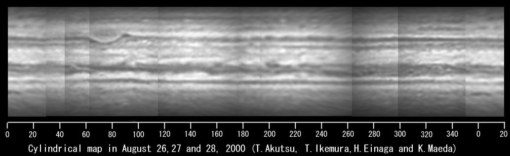 図1 2000年8月26-28日の木星展開図 撮影/阿久津富夫(32cm反射)、池村俊彦氏(31cm反射)、永長英夫氏(25cm反射)、前田和儀氏(35cm反射)(拡大) |