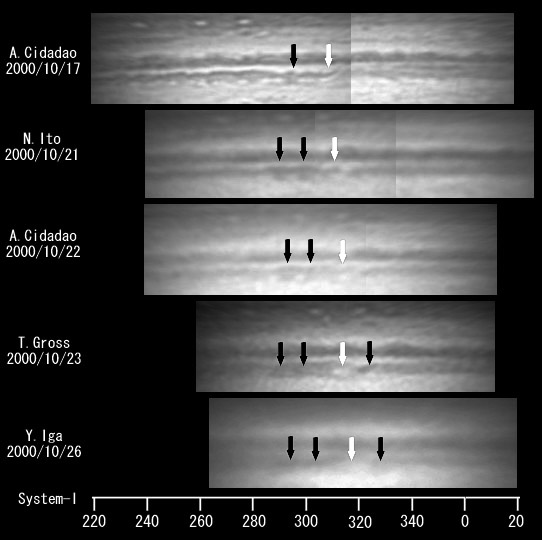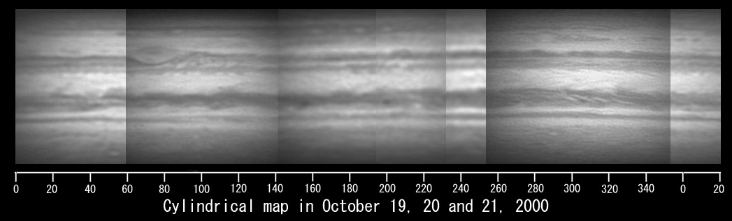 図2 2000年10月19/20/21日の木星展開図 撮影/伊藤紀幸氏(60cm反射)、永長英夫(25cm反射)、前田和儀氏(35cm反射)(拡大) |
