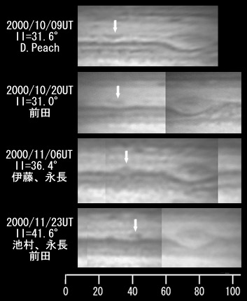 このままのドリフトを続けると、暗斑は2001年2月上旬にはGRS前端に達することが予想されます。過去には、1994年頃に形成されたSTrZの白斑が、1997年5月にGRSと会合した現象が観測されています。この時は約13日かけて、白斑がGRSを反時計方向にぐるりを回り込み、一度GRS後方のSTrZに出現した後に、GRSの気流に飲み込まれました。今回も、STrZの巨大な渦がGRSの気流に飲み込まれるだろうと考えられますが、1月〜2月にかけての観測によってその詳細を追跡できればと思います。