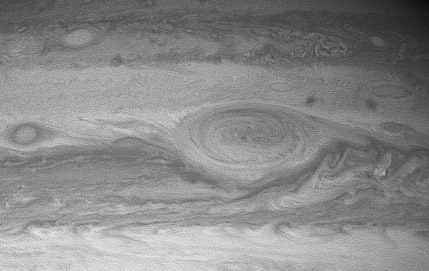 STrZ(南熱帯)のGRS(大赤斑)の前方に暗斑が出現し、大きさがGRSの1/4ほどの大きな渦であることがわかりました。図1に示すように、10月9日UTのDamian Peach氏(イギリス)、10月10日UTの中西英和氏(愛知県)の画像では、それまでに見えていたSTrZのストリークの一部のII=31.6度に顕著な濃化部が見られます。10月20日UTの前田和儀氏(京都)の画像では、次第に暗斑らしくなってきました。11月に入ると6日UTにII=36.4度(伊藤、永長)、23日UTに41.6度(池村、永長、前田)に観測され、+9度/月で後退しています。土星探査機カッシーニによる観測では、10月1日UTには暗斑は形成されておらず、10月22日UTに渦としての暗斑が見られます。カッシーニの最新の12月1日UTの画像(図2)では、顕著な渦が大赤斑に接近しつつある様子がとらえられています。