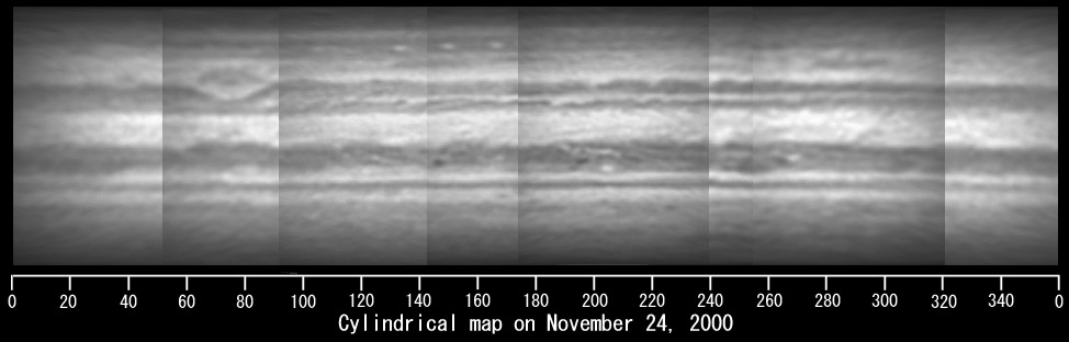 図3 2000年11月24日UTの木星展開図 撮影/ 伊藤紀幸氏(60cmカセグレイン)、永長英夫氏(25cmニュートン)(拡大) |