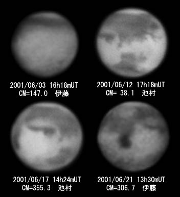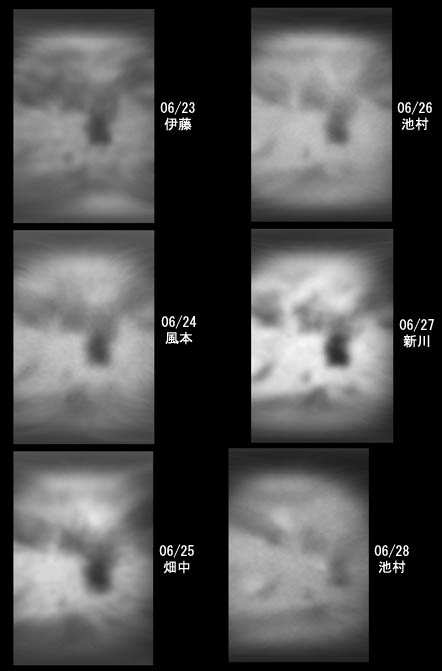 5月に南極冠の最大の時期を終え、6月は南極冠が縮小していく季節です。しかしながら、見かけの緯度が次第に北に偏っていき、南極冠は地球からは見えにくい位置になりました。大きくなった南極冠を観測しようと試みましたが、残念ながら、だれも南極冠らしい姿を認められませんでした。南極冠は最大の時期を過ぎますと、溶けはじめ(昇華しはじめ)ます。それにともない、南極付近は気圧が高くなり、火星大気は風が北に向かって吹くようになります。いよいよ砂嵐の時期が近づいてきたわけです。例年の接近では砂嵐はLsが200°を越えないと目立たないので、今月は砂嵐が起こっても小規模なものと考えていました。