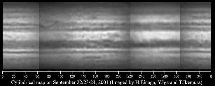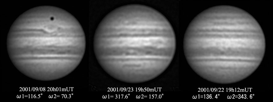 GRS(大赤斑)は先月と同様にII=76°に停滞していますが、赤味が弱くなって見えにくくなっていることと、GRS直後のSEBsに暗斑があって位置がつかみにくい状態です。9月中旬からGRS前方のSTrZ(南熱帯)に向けて、短いstreak(ストリーク)が発生しました。STB(南温帯)の白斑'BA'は、9月23日にII=143.9°にあり、すぐ後方のII=154.7°には楕円形の暗斑があります。昨シーズンには40°ほどのベルトだったものが急速に縮小して、いよいよ楕円形の暗斑に変わってしまいました。'BA'はこのままのドリフトを続けると、2002年1月末にはGRSに接近するでしょう。