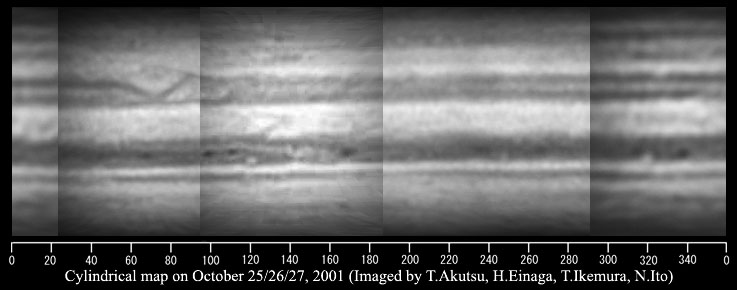 GRS(大赤斑)はII=77°にあり、10月10日頃から南側を暗いアーチに取り巻かれるようになりました。10月末にはGRS直後の暗部が濃くなっていて、さらにアーチの活動が活発になることが予想されます。そして、GRSから前方のSTrZ(南熱帯)に向けてdark streakが形成されると思われます。ところで、GRS前方のSTrZには2個の暗斑が観測されています。調べてみると、最初は8月中旬にII=3°、9月末にはII=20°まで後退しているSEBs(南赤道縞南組織)の暗斑で、その後はSTrZの暗斑となってゆっくりと後退するようになっています。さらに10月19日にはII=34°にも新たな暗斑が出現しています。しばらくの間は、GRSの前方の経度(II=0°〜60°)のSTrZに注意してください。